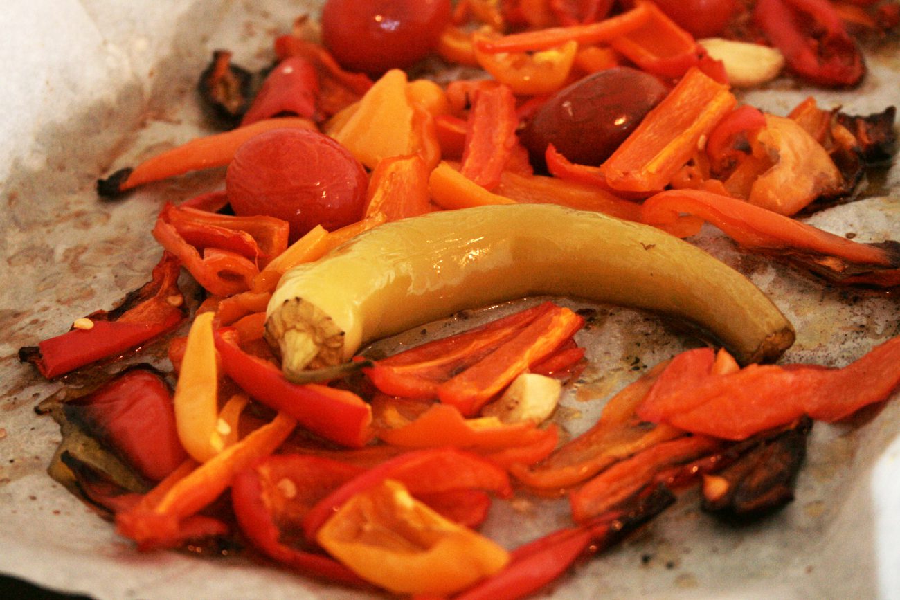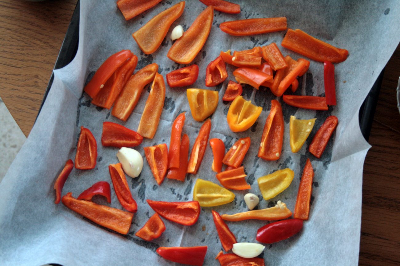 כמו ממקודם חותכים את הפלפלים לרצועות עבות מניחים בתבנית ביחד עם העגבניות שיני השום והפלפל החריף , מזלפים שמן זית מלח ופלפל ומכניסים לתנור ל30-40 דקות עד שיש ריח ממש טוב של פלפל קלוי (: אך לא שרוף …